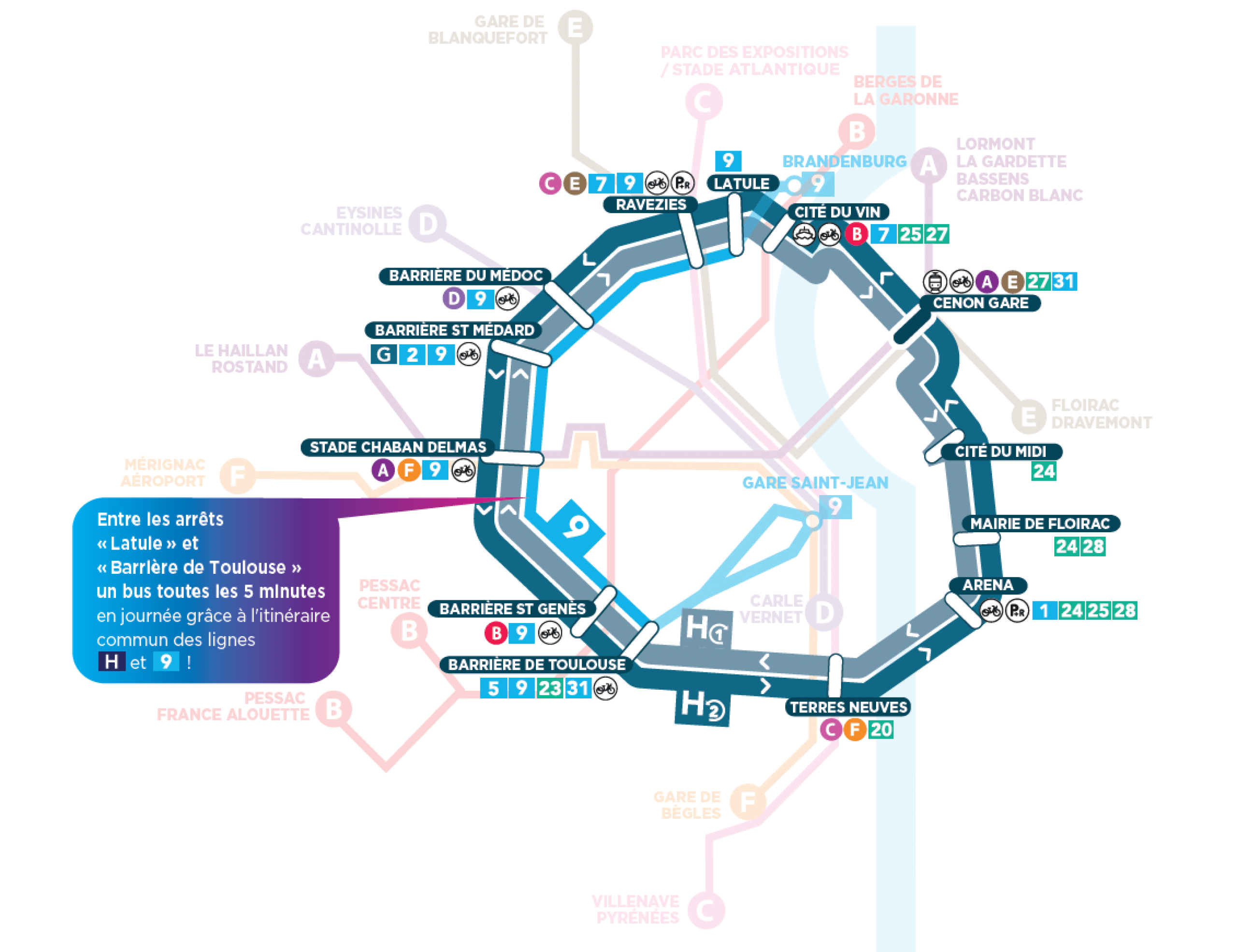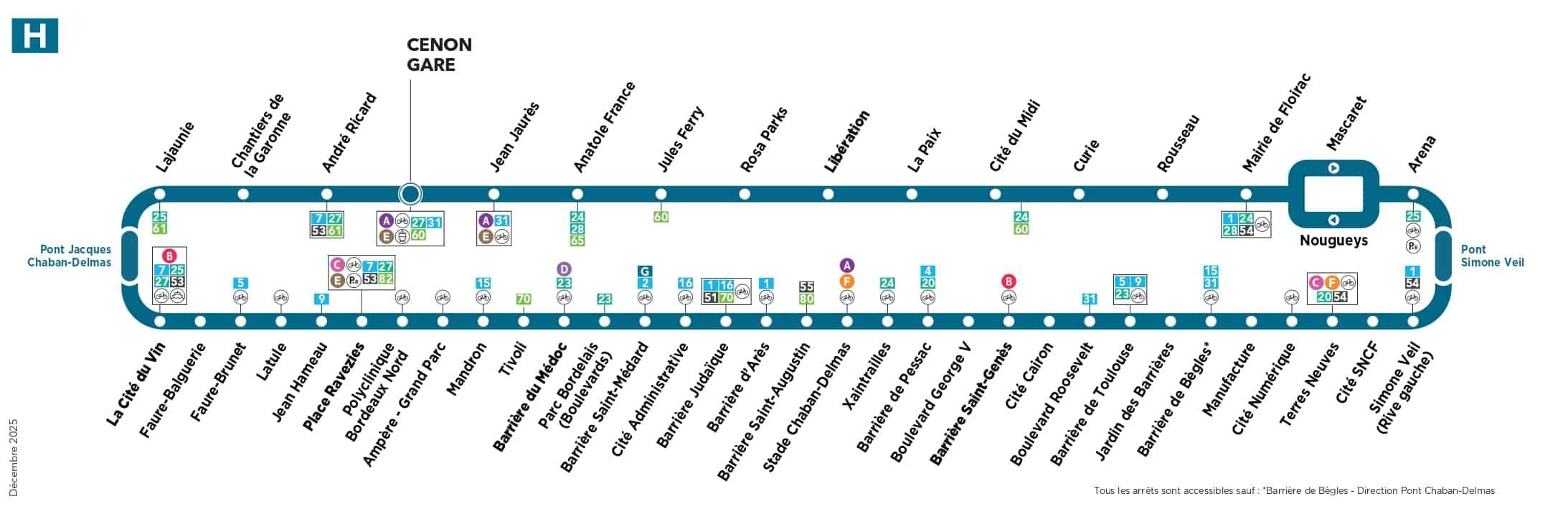 La Ligne H2 circule dans le sens extérieur : entre Cenon Gare, le pont Chaban Delmas, Ravezies, la Cité Administrative, le stade Chaban Delmas, les boulevards , le pont Simone Veil, Floirac et Cenon Gare.